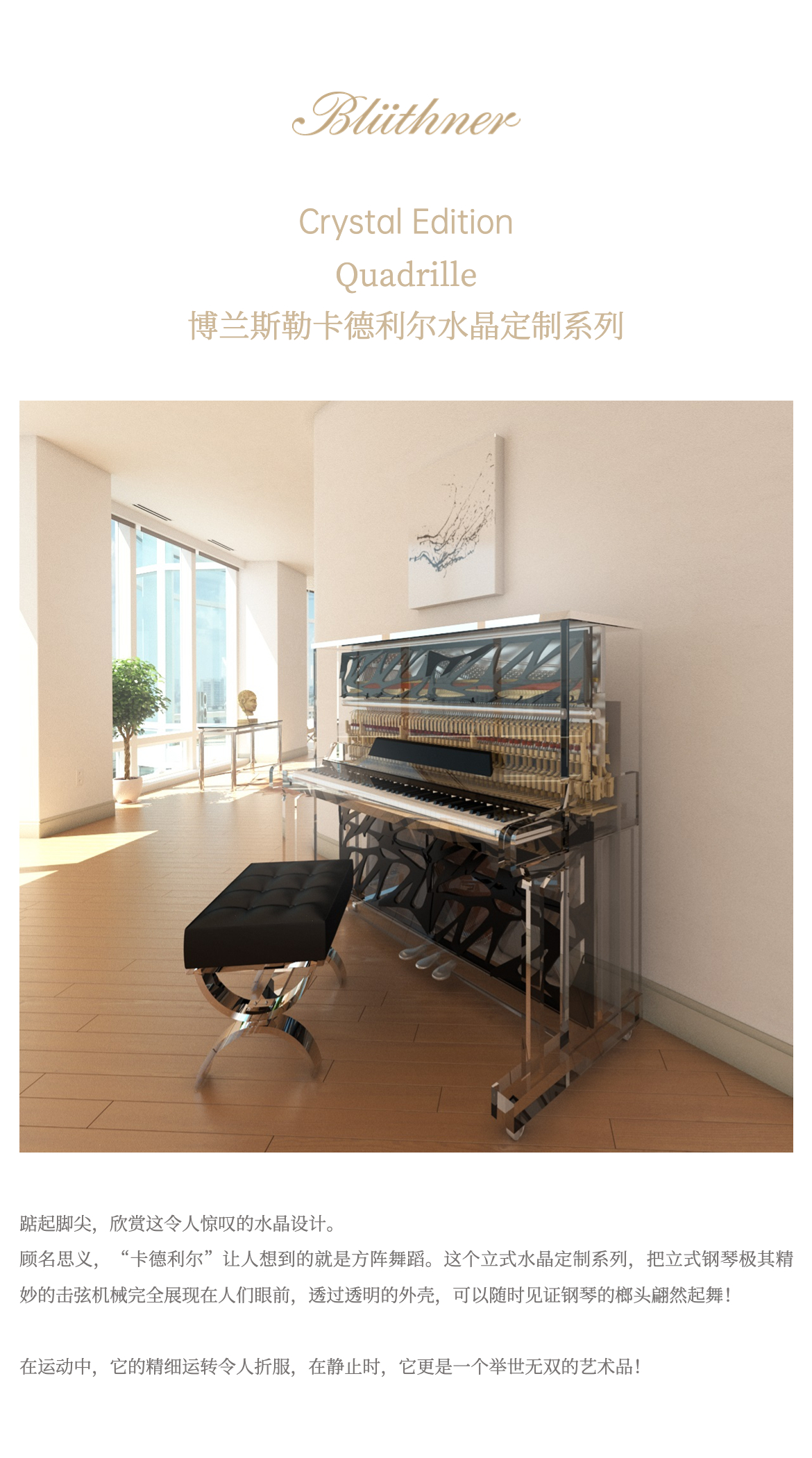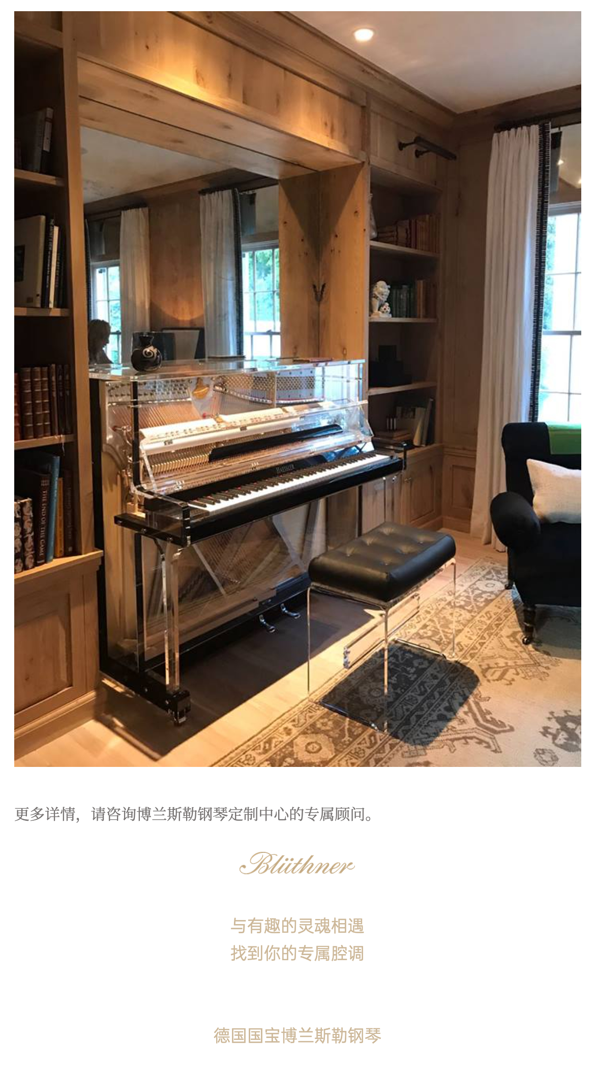 每臺鋼琴均接受定制,可根據(jù)您的品味或需求指定特殊飾面與個性化裝飾。從典雅的鑲木板材與手工雕刻鑲嵌工藝,到最具創(chuàng)新性的現(xiàn)代藝術(shù)造型,博蘭斯勒皆可助您實(shí)現(xiàn)美學(xué)構(gòu)想。